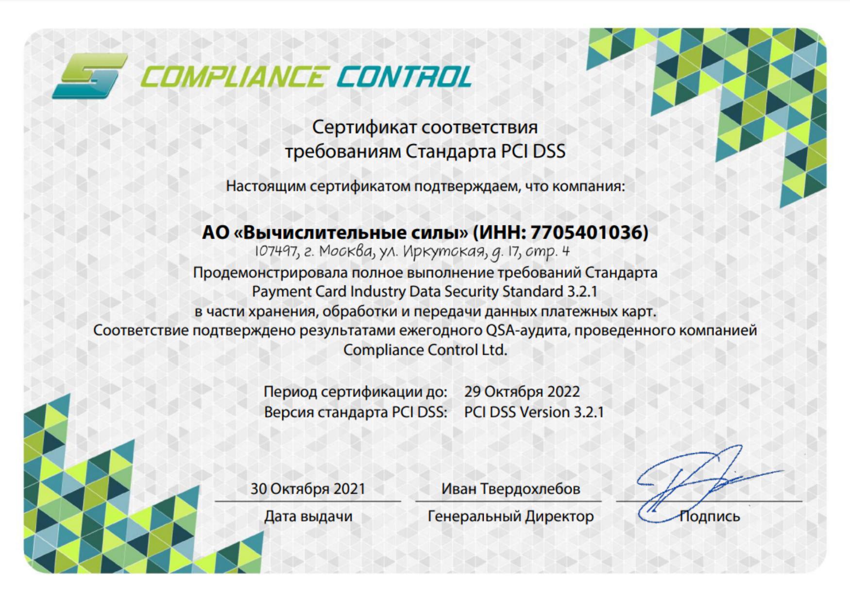 Сертификат соответствия требованиям стандарта PCI DSS версии 3.1